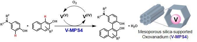Abstoract: Cross-dehydrogenative coupling (CDC) reactions offer an atom-economical approach for synthesizing biaryl compounds by directly forming C─C bonds from the C─H bonds of two aromatic molecules. In this study, the CDC reaction between 4-aminophenols and 2-naphthols was successfully catalyzed using a mesoporous silica-supported oxovanadium catalyst. This reaction involved the catalytic, chemo- and regio-selective oxidation of 4-aminophenols, with molecular oxygen as the terminal oxidant, eliminating the need for stoichiometric chemical oxidants, thereby making the reaction more environmentally friendly.