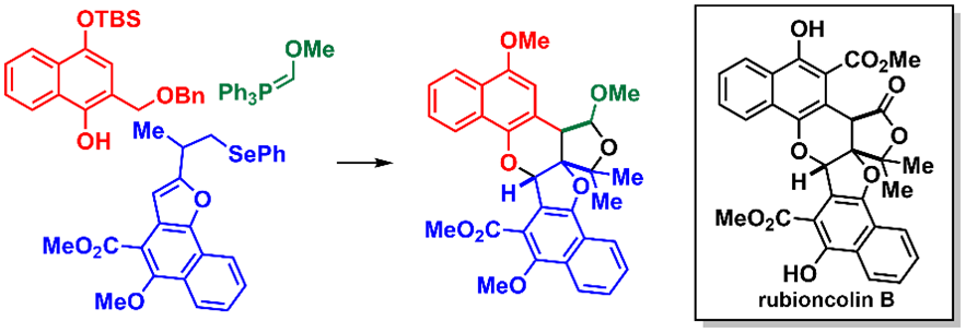 Abstract: Herein, we report our synthetic studies toward rubioncolin B (1), a heptacyclic naphthohydroquinone dimer with antitumor activity. Our strategy is based on the intermolecular [4 + 2]-cycloaddition reaction between an ortho-naphthoquinone methide (o-NQM), which is generated in situ from a 1-naphthol derivative under catalytic Lewis acid conditions, and a naphthofuran derivative, thereby enabling the construction of a hexacyclic compound. We then explored three synthetic approaches for appending the remaining ring structure to the hexacyclic compound. Among them, the sequence involving the introduction of a Wittig reagent and subsequent cyclization proved effective, furnishing a cyclic acetal with the same ring structure as 1. This strategy not only demonstrates that accessing the highly congested architecture of 1 is feasible but also provides a versatile platform for the synthesis of structurally diverse analogs, thereby facilitating subsequent biological investigations, including structure–activity relationship studies.